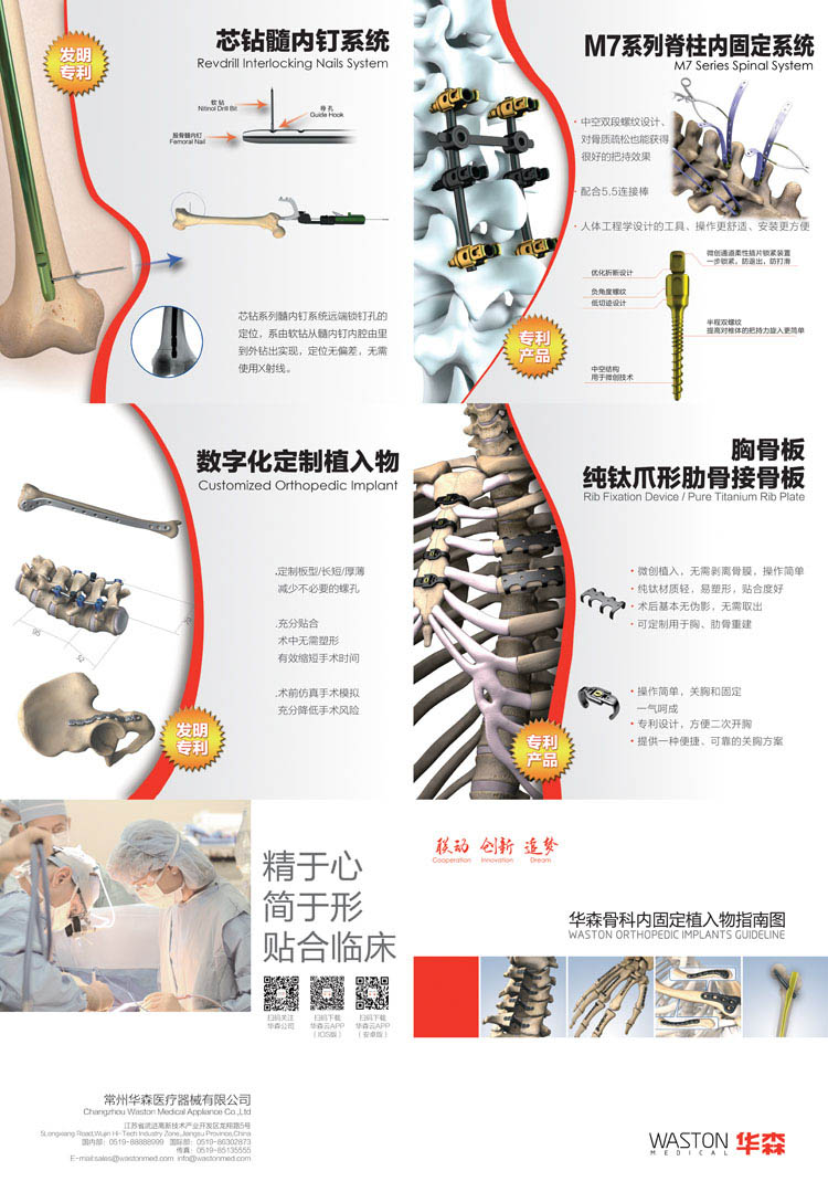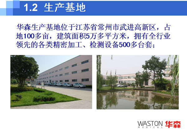 華森醫(yī)療集團(tuán)是常州聯(lián)合工具集團(tuán)控股的,由常州華森醫(yī)療器械有限公司、常州華森生物科技有限公司、常州華森醫(yī)療科技有限公司、華森三家聯(lián)動科技創(chuàng)新中心、上海民衛(wèi)醫(yī)療器械有限公司等企業(yè)組成的集研發(fā)、制造、銷售、服務(wù)于一體的專業(yè)化醫(yī)療、健康產(chǎn)業(yè)集團(tuán)。 公司總部坐落于風(fēng)景秀麗的江南制造業(yè)基地——常州市武進(jìn)高新區(qū),西鄰常州飛機(jī)場,北靠滬寧高速公路,南依沿江高速公路,交通十分便利。 集團(tuán)核心成員——常州華森醫(yī)療器械有限公司是由常州聯(lián)合工具集團(tuán)和日本オーテー株式會社在2001年聯(lián)合投資5000萬人民幣成立的,專注于骨科、胸外科植入物等產(chǎn)品的開發(fā)、制造、營銷、服務(wù)的醫(yī)療器械專業(yè)廠家。自2001年成立以來已經(jīng)成為行業(yè)領(lǐng)先的和國內(nèi)最具活力的公司之一。 華森醫(yī)療公司采用事業(yè)部制管理結(jié)構(gòu),現(xiàn)公司下設(shè)為骨科事業(yè)部、吻合器事業(yè)部、手術(shù)工具事業(yè)部及胸外科產(chǎn)品事業(yè)部等四大事業(yè)部。主要生產(chǎn)三類6846骨科植入物及人工 、二類6801基礎(chǔ)外科手術(shù)器械、6825醫(yī)用高頻儀器設(shè)備、6808腹部外科手術(shù)器械及吻(縫)合器,專利爪型純鈦肋骨接骨板等產(chǎn)品。 公司三大生產(chǎn)基地占地面積100多畝,建筑面積35000多平方米,十萬級凈化車間2000多平方米。中高級以上職稱的研發(fā)、生產(chǎn)、質(zhì)控、管理人員占員工總?cè)藬?shù)的30%以上。公司設(shè)備精良,擁有包括德國DMG、CHIRON、美國HASS五軸加工中心、日本STAR縱切機(jī)床、SODICK慢走絲線切割在內(nèi)的著名品牌加工中心及其它高精密度機(jī)械加工設(shè)備一百多臺套,檢測設(shè)備齊全。公司與北京協(xié)和醫(yī)院,北京軍區(qū)總醫(yī)院,南京醫(yī)科大學(xué)、蘇州大學(xué)等著名醫(yī)院、學(xué)院進(jìn)行學(xué)術(shù)、技術(shù)聯(lián)盟,并依托兩大母公司的雄厚實(shí)力形成了強(qiáng)大的研發(fā)力量和生產(chǎn)能力。 華森公司為ISO13485:2003(YY/T0287-2003)國際質(zhì)量體系認(rèn)證企業(yè),所有產(chǎn)品全面通過歐盟CE認(rèn)證,其中華森吻合器已經(jīng)率先獲得了美國FDA510(K)認(rèn)證。經(jīng)過幾年的努力,華森WASTON品牌產(chǎn)品不僅出口到南美、中東、東南亞、東歐、北非等發(fā)展中國家,而且已經(jīng)開始進(jìn)入美國、法國、瑞士、德國、意大利、英國等歐美傳統(tǒng)發(fā)達(dá)國家。特別是與美國、歐洲的一些行業(yè)著名企業(yè)建立了合作聯(lián)盟關(guān)系,為華森產(chǎn)品達(dá)到或超過國際同類產(chǎn)品打下了堅實(shí)的基礎(chǔ)。 我們歡迎國內(nèi)外新老客商、朋友前來華森考察洽談、技術(shù)交流、合作合資,與華森公司共創(chuàng)美好明天。