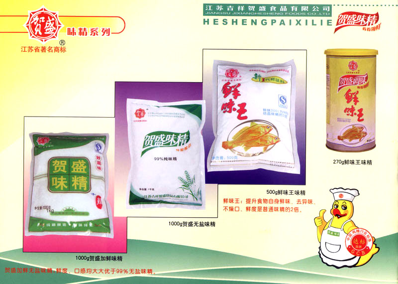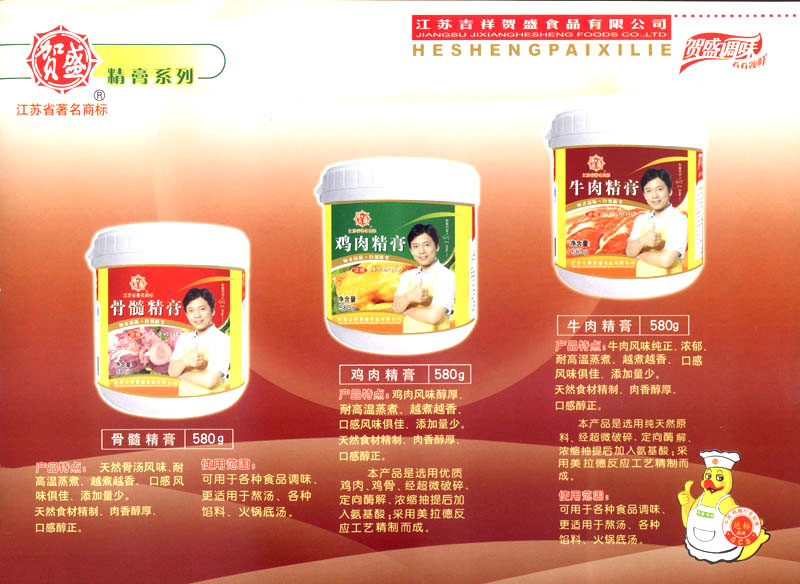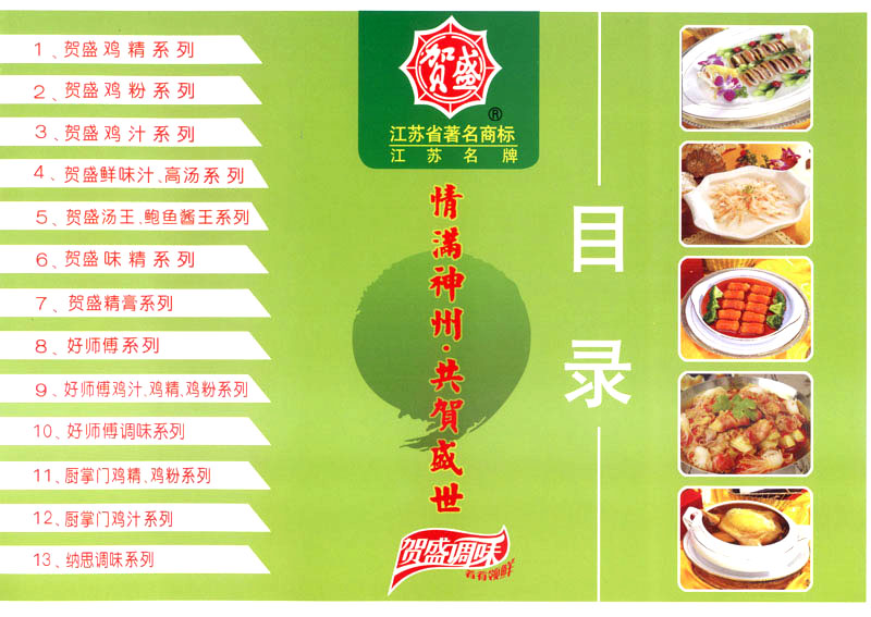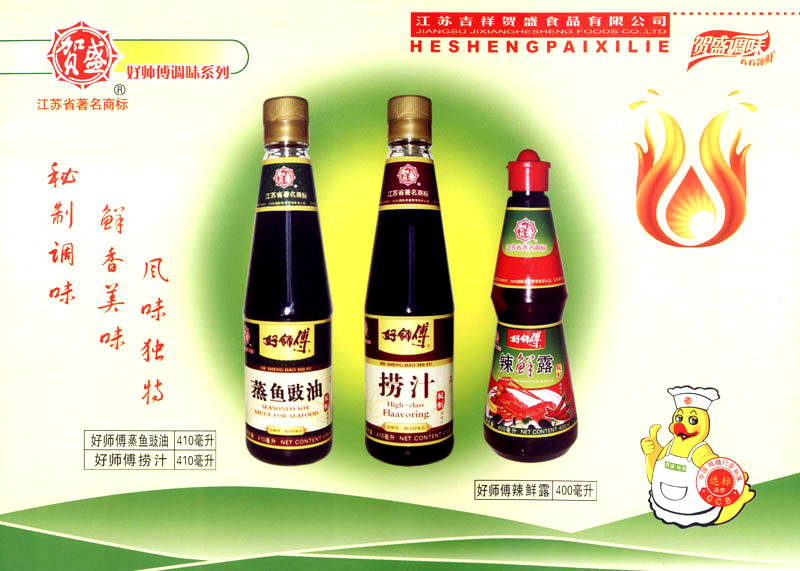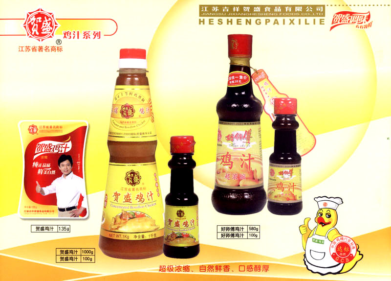 江蘇吉祥賀盛食品有限公司是一家中國(guó)專(zhuān)業(yè)餐料知名制造商,公司座落在經(jīng)濟(jì)高度發(fā)達(dá)“長(zhǎng)三角”的常州市,緊靠312國(guó)道,滬寧高速與沿江高速交匯處,距常州火車(chē)站及長(zhǎng)江水運(yùn)碼頭20千米,交通十分便利。公司占地面積23500平方米,花園式工廠、廠房面積18500平方米,現(xiàn)在員工330余名,其中擁有中、高級(jí)職稱(chēng)管理和技術(shù)人員58名,生產(chǎn)場(chǎng)地均按食品和藥品GMP要求設(shè)計(jì)、全封閉車(chē)間、中央空調(diào)系統(tǒng)、閉路電視監(jiān)控系統(tǒng)。目前已建成成三條雞精,雞粉生產(chǎn)線。一條雞汁生產(chǎn)線。一條鮮味汁生產(chǎn)線。一條醬汁精膏類(lèi)生產(chǎn)線,規(guī)劃年生產(chǎn)能力達(dá)30000噸。 “賀盛”品牌取自《詩(shī)·大雅·下武》中“受天之祜、 四方來(lái)賀”;《易經(jīng)》中“富有謂之大業(yè),日新之謂盛德”,賀盛企業(yè)師法源遠(yuǎn)流長(zhǎng)中華飲食文化,融匯中西健康美食調(diào)味。相繼研發(fā)生產(chǎn)出高品質(zhì)的“賀盛牌”味精、雞精、雞粉、雞汁、湯王、鮑魚(yú)醬王、鮮味汁調(diào)味素和各種風(fēng)味熱反應(yīng)精膏等系列產(chǎn)品。二十年來(lái)“賀盛”產(chǎn)品質(zhì)量獲得廚藝界專(zhuān)業(yè)人士和消費(fèi)者的一致好評(píng)和高度認(rèn)可。 賀盛企業(yè)和產(chǎn)品相繼榮獲1995年“首界中國(guó)國(guó)際食品博覽會(huì)金獎(jiǎng)”,2001年企業(yè)通過(guò)ISO-9001國(guó)際質(zhì)量體系認(rèn)證,2003年江蘇省“計(jì)量保證確認(rèn)單位”,2004年獲得自營(yíng)出口權(quán),2005年賀盛雞精榮獲“江蘇名牌產(chǎn)品”,2006年賀盛商標(biāo)被評(píng)為“江蘇省著名商標(biāo)”,2007年通過(guò)HACCP認(rèn)證,全部產(chǎn)品均通過(guò)QS食品安全認(rèn)證,并積極努力爭(zhēng)創(chuàng)中國(guó)名牌,中國(guó)馳名商標(biāo)。 公司銷(xiāo)售網(wǎng)點(diǎn)建設(shè)發(fā)展迅速,相繼組建上海、南京、河南、海南、新疆全資分公司;辦事處、經(jīng)銷(xiāo)商覆蓋全國(guó),并出口日本、香港及東南亞地區(qū)。二十年來(lái),在公司總裁周?chē)?guó)林先生帶領(lǐng)下,全體同仁秉承“厚德載物、自強(qiáng)不息”宗旨,發(fā)揚(yáng)“以人為本、科技創(chuàng)新、自我加壓、爭(zhēng)創(chuàng)一流”的企求精神;致力于傳承中華飲食文化,融化西方美食精粹,不斷的研發(fā)、創(chuàng)新,奉獻(xiàn)更多更好的調(diào)味料,讓生活更有滋味。公司總裁周?chē)?guó)林先生攜全體員工熱誠(chéng)歡迎各位新老朋友蒞臨指導(dǎo),洽談合作!