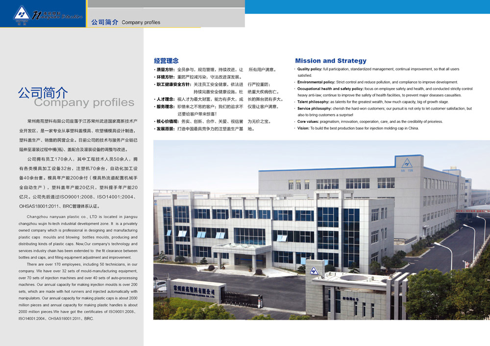 常州南苑塑料有限公司是一家專業(yè)從事塑料蓋模具、吹塑桶模具設計制造及塑料蓋產(chǎn)品生產(chǎn)和銷售的民營企業(yè)。公司創(chuàng)建于1991年,總投資8000萬元,擁有工程技術人員50余人,品質(zhì)管理人員20余人;各類注塑設備70余臺套。模具加工設備40余臺套,模具年產(chǎn)能200余付,塑料蓋年產(chǎn)能20億只,塑料提手年產(chǎn)能20億只。產(chǎn)品涉及潤滑油、食品和保健品行業(yè)。主要客戶有:中石化、中石油、道達爾、埃爾夫、景田、怡寶、農(nóng)夫山泉等知名品牌的生產(chǎn)商!