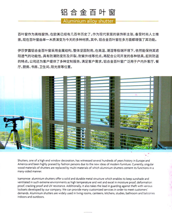 常州伊莎夢(mèng)露百葉窗有限公司成立于2010年,是一家專業(yè)從事高端鋁臺(tái)金百葉窗以及百葉窗五金配件研發(fā)、生產(chǎn)、銷售和服務(wù)的現(xiàn)代化企業(yè)。公司本著“誠信為本,客戶至上”的原則。產(chǎn)品遠(yuǎn)銷大洋洲、歐洲、美洲等多個(gè)國家,并得到客戶的一致認(rèn)可。 目前公司具有比較先進(jìn)的生產(chǎn)設(shè)備及檢測(cè)手段和完善的質(zhì)量保證體系和管理制度,在這基礎(chǔ)上公司每年加大研發(fā)投入,陸續(xù)獲得十多項(xiàng)專利。今后公司還將繼續(xù)堅(jiān)持品牌發(fā)展戰(zhàn)略,提升市場(chǎng)能力,為消費(fèi)者提供更加優(yōu)質(zhì)的產(chǎn)品和服務(wù)。地址:江蘇省常州市經(jīng)濟(jì)開發(fā)區(qū)橫山橋鎮(zhèn)朝陽村大橋工業(yè)園509號(hào)電話:0519-88763142 傳真:0519-88762898網(wǎng)址:www.chinaismr.cn郵箱:Isamonroe-liu@outlook.com 48980807@qq.com