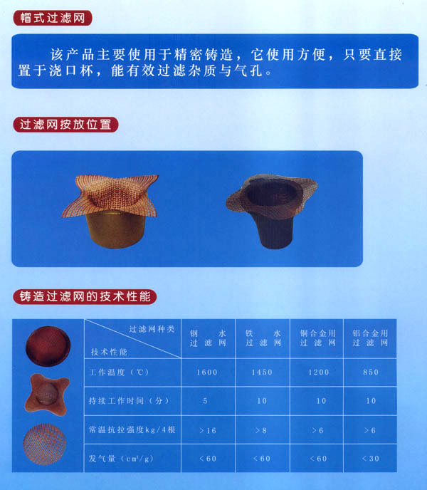 常州市猛將過濾網有限公司是專業(yè)生產系列鑄造過濾網的廠家。主要產品有:鐵水過濾網、鋼水過濾網、銅水過濾網、鋁水過濾網及熔模用帽式過濾網等。本廠產品是哈工大科研成果,榮獲國家經委頒發(fā)的新技術成果獎。航天部科技進步一等獎;中國質量檢驗協(xié)會授予“猛將”牌高硅氧過濾網“國家權威檢測達標產品”榮譽證書;我廠生產的“四角帽式過濾網”獲國家專利局外觀設計專利證書;并獲香港國際新技術新產品博覽會“金獎證書”。2002年獲亞洲國際新技術新產品博覽會“科技發(fā)明進步獎”,2002年本廠所生產的“四角帽式過濾網在首屆“金艦杯”國際新技術成果網絡交易會活動中成績顯著,被評為金杯獎。同年在日內瓦國際專利技術成果博覽會中被評為國際優(yōu)秀專利金獎。目前,本廠產品銷往全國各省、市、自治區(qū),是國內銷量最大的廠家之一。同時出口韓國、泰國、東南亞等國家。進入21世紀以來,我國加入WTO后,我廠在哈工大葉榮茂教授的指導下,開發(fā)研制出一種多孔泡沫陶瓷過濾網,該產品兼具玻璃纖維過濾網和直孔過濾網的篩分夾渣功能,且更具有吸附微小夾渣氧化物的功能。多孔泡沫陶瓷過濾網的主要工作原理是讓紊亂、翻騰的(TV urbuItnt Flow)金屬液經過產品形成平穩(wěn)、均勻(SmoothFlow)的金屬液,金屬液經過復雜的多孔泡沫陶瓷過濾網,能有效地吸附截留微小氧化夾渣物,并溢除氣泡,然后能使鑄件產品達到純潔度高、強度高、韌性好、機械加工性能好等特點,從而能夠降低生產成本,提高產品成品率,增加經濟效益。我廠熱忱歡迎廣大用戶使用該產品。 我公司設計發(fā)明的“四角帽式過濾網”,已在2001年3月申請專利,并于當年11月底經中華人民共和國知識產權局授權公告。頒布了外觀設計專利證書,證書號第207620號,F有個別廠家悍然侵權,公然在有關鑄造媒體打出侵權產品廣告。對此,我們鄭重聲明,要求侵權廠家盡快采取糾正措施,為了維護我們的知識產權,我們不排除采取法律行動的可能。