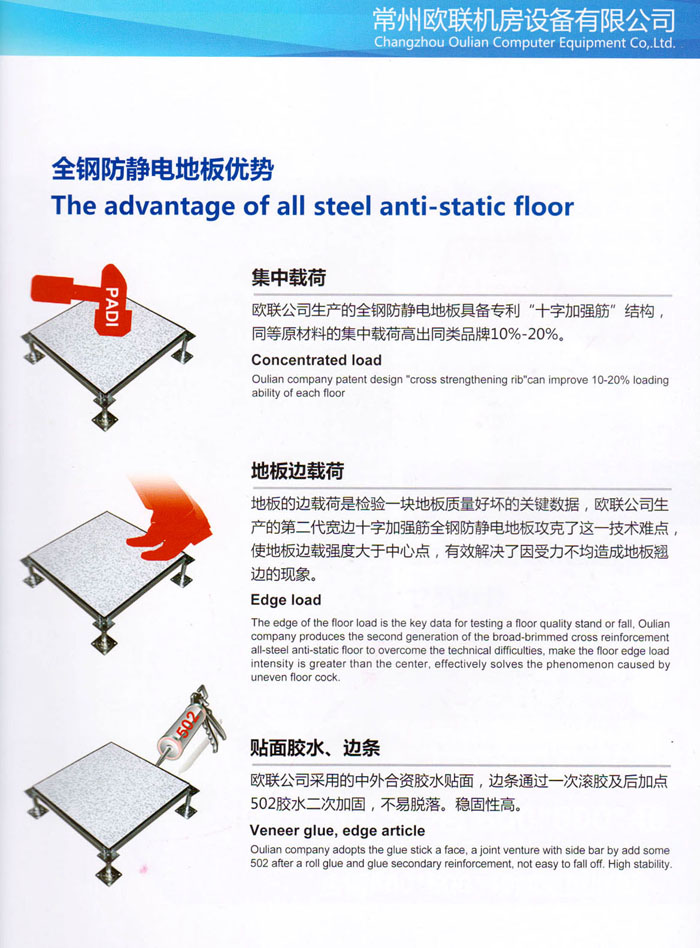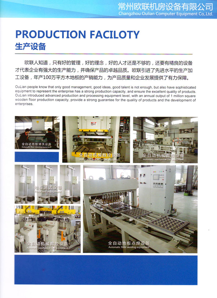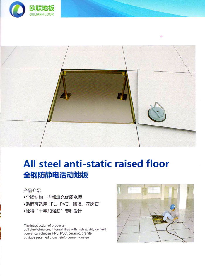 防靜電高架活動地板、全鋼地板、陶瓷地板是計算機行業(yè)發(fā)展起來的新型鋪地材料,隔離了潮氣、靜電灰塵,最重要的是解決了綜合布線問題,無需預(yù)埋管線,可隨時拆卸、搬移,保證了資訊設(shè)備完整的優(yōu)點,適應(yīng)了智能化樓宇中信息自動化技術(shù)對所處環(huán)境的特定要求,避免了廣大客戶的雙重投資,使現(xiàn)代化辦公程度更加高效,辦公場所更加舒適。 “歐聯(lián)”系列全鋼地板,符合國家安全要求,種類完備多樣,其中防靜電陶瓷地板、硫酸鈣地板等除具有普通瓷質(zhì)的裝飾和實用性外,其耐磨、防水、防火功能優(yōu)于其它同類產(chǎn)品,防靜電系列地板,能切合不同客戶的要求,其靈活的配置,深受客戶歡迎,不同材質(zhì)的地板結(jié)構(gòu)使設(shè)計師的設(shè)計空間比傳統(tǒng)的更加廣闊自由和善變。 公司大力發(fā)展國內(nèi)外銷售業(yè)務(wù),多次中標(biāo)國內(nèi)重點工程 ,例:哈爾濱醫(yī)科大學(xué)、山東大學(xué)、上海普通機場等。 公司將一如既往開發(fā)和制造一流的產(chǎn)品,愿與廣大有識之士合作發(fā)展,共創(chuàng)美好未來。