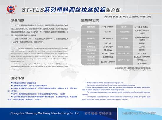 常州神通機(jī)械制造有限公司位于滆湖之盼,依托常州市武進(jìn)區(qū)優(yōu)越的地理環(huán)境,公司創(chuàng)建于1992年,是專業(yè)生產(chǎn)塑料機(jī)械拉絲機(jī)成套設(shè)備的企業(yè)。 神通公司經(jīng)過30年多來的艱辛創(chuàng)業(yè),在塑料機(jī)械行業(yè)中積累了豐富的經(jīng)驗(yàn),為擴(kuò)大生產(chǎn)能力,提升產(chǎn)品質(zhì)量,新組建了一個(gè)技術(shù)緊密合作型企業(yè),并具有獨(dú)立法人資質(zhì),即為宜興順通機(jī)械制造有限公司。我們會(huì)一如既往地努力,堅(jiān)持走“順通”的品牌之路,愿與各位同行攜手共創(chuàng)未來,為塑料機(jī)械行業(yè)的發(fā)展作出貢獻(xiàn)。 神通公司擁有標(biāo)準(zhǔn)廠房共計(jì)15000m²,現(xiàn)有先進(jìn)的三軸、四軸聯(lián)動(dòng)的加工中心,數(shù)控鉆床、銑床、車床、外圓磨床、剪板機(jī)、折彎機(jī)等高精度加工設(shè)備。 神通公司以精湛的生產(chǎn)工藝、完善的管理體系和滿意的售后服務(wù),得到新老用戶的信賴。設(shè)備外形美觀、結(jié)構(gòu)合理、性能安全可靠、具有先進(jìn)的控制系統(tǒng)等優(yōu)點(diǎn),物美價(jià)優(yōu),得到新老用戶的一致好評(píng)。 神通公司對(duì)產(chǎn)品質(zhì)量要求是:從原材料采購到成品出廠,均執(zhí)行品質(zhì)控制。 神通公司堅(jiān)持“以人為本、誠信經(jīng)營、科技興業(yè)、精益求精、以質(zhì)取勝、合作共贏”的經(jīng)營理念!耙再|(zhì)量求生存,以創(chuàng)新求發(fā)展”的企業(yè)精神。 主營業(yè)務(wù): 1.雙色人造草坪單絲、雙色人造草坪曲絲一步法、人造草坪開網(wǎng)絲拉絲成套生產(chǎn)線設(shè)備系列,及草坪絲一步法捆綁收卷機(jī)、一步法捻線機(jī)、絡(luò)筒機(jī)。 2.PE、 PP、 PA、PET圓絲、工業(yè)單絲等拉絲成套生產(chǎn)線設(shè)備系列。 3.集裝袋、編織袋、土工布、PP基布、遮陽網(wǎng)、捆草網(wǎng)、蓋土網(wǎng)等平膜扁絲拉絲機(jī)成套生產(chǎn)線設(shè)備系列。 4.電纜填充網(wǎng)狀絲、PP縱向拉伸膜、PE壓花膜成套生產(chǎn)線設(shè)備系列,及各種特殊規(guī)格的電纜填充繩收卷機(jī)等電纜材料輔助設(shè)備5.高低壓PP,PE吹膜機(jī)及撕裂膜、捆扎帶生產(chǎn)線設(shè)備系列。 6.塑料回收造粒機(jī)組、邊絲回收裝置及粉碎機(jī)等。 7.圈、扁絲磁性收卷機(jī)、變頻無刷電機(jī)收卷機(jī),圓絲工字盤、橄欖形、寶塔形收卷機(jī)及浸膠線專用收卷機(jī)。 8.舊塑料拉絲機(jī)設(shè)備改造、可定做特殊規(guī)格的圓、扁絲帶捻度專用收卷機(jī)、繩網(wǎng)絡(luò)筒機(jī)及其它收卷機(jī)。