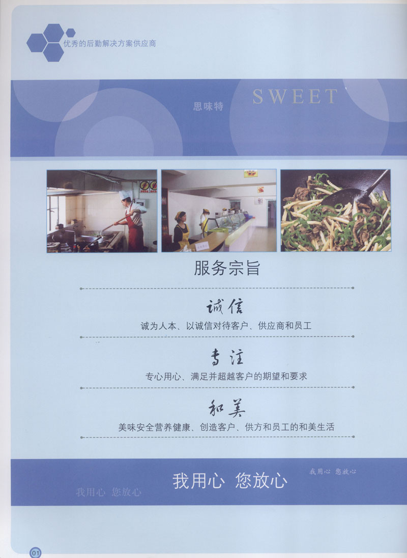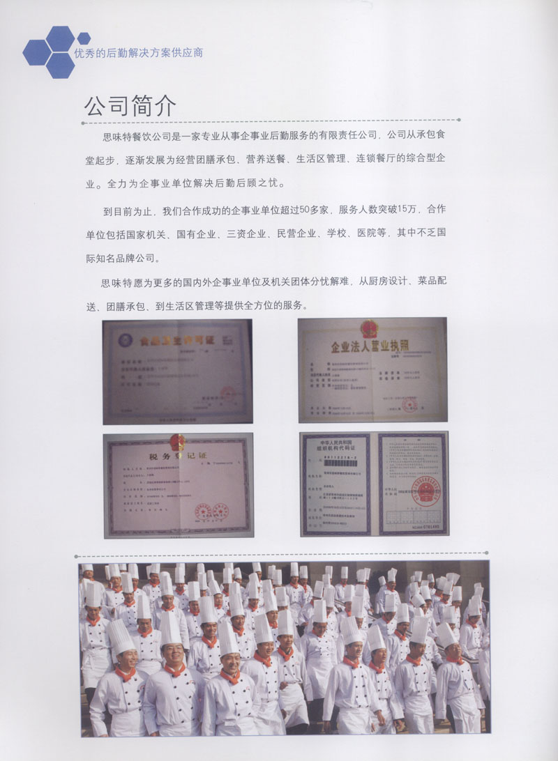 常州市思味特餐飲有限公司是一家專業(yè)從事企事業(yè)后勤服務(wù)的有限責(zé)任公司,公司從承包食堂起步,逐漸發(fā)展為經(jīng)營團(tuán)膳承包、營養(yǎng)送餐、生活區(qū)管理、連鎖餐廳的綜合型企業(yè)。2008年公司斥資100萬元,在常州興建了可以同時提供3000餐膳食的中央廚房,重點(diǎn)打造“和美客”后勤服務(wù)品牌,全力為企事業(yè)單位解決后勤后顧之憂。