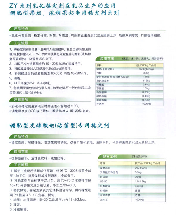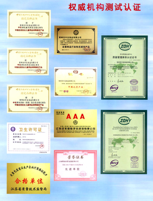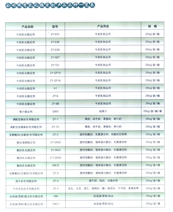 常州市中友食品有限公司。基地位于常州市東郊開發(fā)區(qū),廠房占地面積6000平方米,擁有全新的生產線,先進的生產流程和嚴格的質量管理體系(工廠已通過IS09001:2000質量管理體系的認證)。并有專業(yè)的技術開發(fā)和理化檢驗的設施、經驗豐富的技術人員。公司以科技為依托,常年與高等院校合作,不斷地開發(fā)和研制適合市場需求的食品添加劑系列產品。公司每年面向全國招收優(yōu)秀的博士、碩士及優(yōu)秀的大學生。公司現有員工1 00多人,管理人員2 0名、高工5名、產品專業(yè)技術開發(fā)人員12名,還有選擇地引進和代理國內外各種適用的食品添加劑。 依靠本公司雄厚的科技力量和先進的科技設備,生產基地已經具備了與客戶共同開發(fā)國內外先進食品添加劑的應用技術。博適中友公司多年來致力于食品添加劑的研究和開發(fā),突破常規(guī)理念,以市場、用戶為中心,研究開發(fā)各個品種、各個檔次的食品添加劑,品種齊全又多樣,既有出口型又有內銷型。公司主要穩(wěn)定劑產品有:乳飲料乳化穩(wěn)定劑、乳酸飲料乳化穩(wěn)定劑、冰淇淋(雪糕)復合乳化穩(wěn)定劑、果汁飲料乳化穩(wěn)定劑等,產品暢銷國內外,覆蓋了全國二十多個省市,并建立了穩(wěn)定的銷售網絡。 本公司對產品指定了嚴格的質量標準,并報請常州市技術檢驗監(jiān)督局審核批準,其技術要求完全符合GB一2760(食品添加劑使用衛(wèi)生標準)和符合聯合國直接衛(wèi)生組織(WHO)、聯合國食品與農業(yè)組織(FAO)以及美國食品和藥物管理局的有關規(guī)定。 長期以來,博適中友公司以市場定位為基本依據,堅持發(fā)展并開辟多元化的國內外市場:以專業(yè)化、長遠化、規(guī)模化為經營思路:以開拓創(chuàng)新,務實誠信為經營理念,不斷促進企業(yè)發(fā)展壯大。 公司自創(chuàng)建以來,始終不渝地堅持質量第一、信譽至上,以精湛的工藝加工產品,不管是標準的或特制的都可享有本公司優(yōu)良的技術服務。無論您需要何種功能性添加劑,博適中友食品添加劑公司均能滿足您的要求。博適中友公司以價格合理、服務周到為經營宗旨,努力引導食品添加劑應用發(fā)展的新潮流、新方向。在才能卓越的領導者的帶領下,全體員工以開拓、創(chuàng)新、求實、守信為企業(yè)精神,不斷地提高自身的素質。 公司的宗旨是“開拓創(chuàng)新發(fā)展、精誠服務和諧”為目標,熱忱與各界有識之士攜手共進,共創(chuàng)輝煌!如今公司業(yè)務蒸蒸日上,專業(yè)技術研究越走越精,這都與廣大客戶大力支持分不開。在新世紀來臨之際,上海博適中友公司愿與您真誠合作,攜手并進,共鑄新的輝煌!
