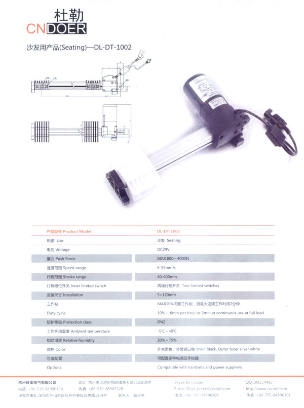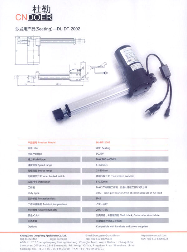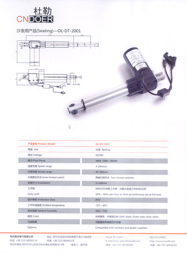 如今,公司為謀求新的發(fā)展,立足于國內(nèi),放眼于國際市場,投入了大量的人力、財(cái)力、物力,購置了先進(jìn)的全自動(dòng)生產(chǎn)流水線、全自動(dòng)繞線機(jī)和各類精密的測試儀器,多功能隔音房等設(shè)施,全新推出了具有美好前景和廣闊市場的主打產(chǎn)品:“杜勒”牌系列線性推桿及各類配套電機(jī)。該產(chǎn)品已通過ISO9001認(rèn)證,產(chǎn)品外觀新穎、制作精良、噪音小、操作靈活簡便,暢銷國內(nèi),遠(yuǎn)銷國外,被廣泛應(yīng)用于電動(dòng)沙發(fā)、醫(yī)療護(hù)理床、手術(shù)床、按摩椅等眾多領(lǐng)域!岸爬铡碑a(chǎn)品已被越來越多的客戶所青睞和認(rèn)可!