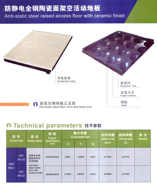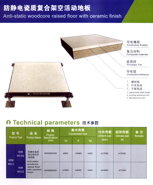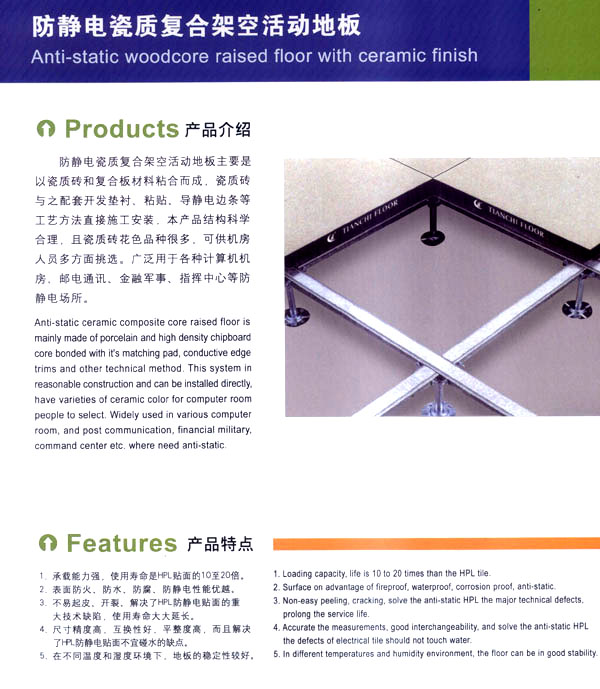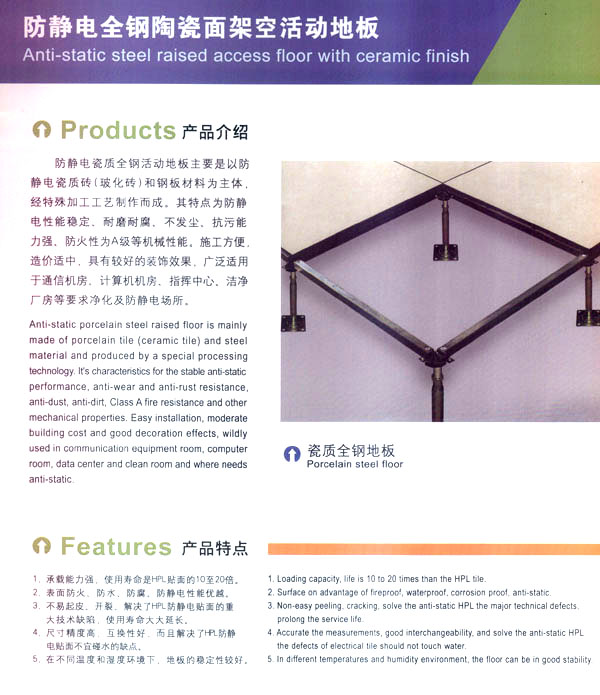 公司專業(yè)生產(chǎn)“天馳”系列活動地板,符合國家安全要求,種類完備多樣,其中防靜電瓷質(zhì)高架通路地板除具有普通瓷質(zhì)的裝飾和實用性外,其耐磨,防水,防火功能優(yōu)于其他同類產(chǎn)品,深受客戶歡迎。