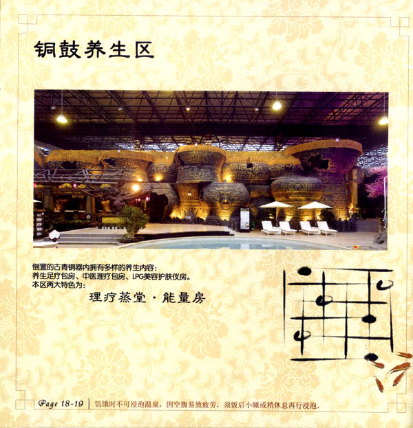 淹城花都溫泉水城孕育天地之精華,悅身、悅?cè)、悅心、悅神。置身其中泉水潺潺,霧氣繚繞、花瓣飄香,恍若仙境!稗渌略谑,弄花香滿衣”,花都溫泉的浪漫與溫潤在這里完美展現(xiàn)。 花都溫泉水城包括洗浴區(qū)、戲水世界、露天溫泉、自助餐廳、生態(tài)房、別墅區(qū)、紅文化房、VIP區(qū)等多種功能區(qū)域,是集溫泉養(yǎng)生、休閑住宿、演藝會務(wù)為—體的休閑度假勝地,給賓客帶來江南小鎮(zhèn)的浪漫水城之旅。 古木新枝畔賓客對酒當(dāng)歌,溪泉石椅旁把茶品啜。 淹城-三勤生態(tài)酒店,這里是一處綠色生態(tài)的美食家園。此地鬼斧神工.奇水異石,和風(fēng)細(xì)雨林中穿過,引百鳥朝來暮歌;這里集生態(tài)餐飲、演藝、中小型會務(wù)為一體,將現(xiàn)代裝飾風(fēng)格和古雅拙樸的自然裝修完美整合;這里聚集大江南北名廚,推出精致綠色美昧佳肴。來到這里,賓客可享田園至美之景,品舌尖至鮮之味,實(shí)乃人生一大樂事。