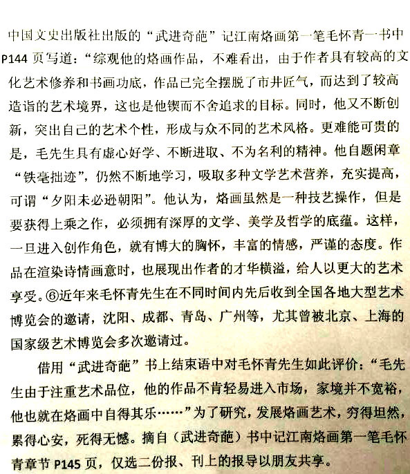 近年來,創(chuàng)作的烙畫作品分別獲得過全國、省市級的金、銀、銅獎多次。中央電視臺曾兩次播放過本人的烙畫作品,江蘇電視臺、常州電視臺也曾多次播放過本人的作品與烙畫藝術生涯,揚子晚報、常州日報、常州晚報也曾多次報導過本人的烙畫作品,出版物有三種版本都能查閱到介紹本的烙畫從藝生涯與藝術業(yè)績。