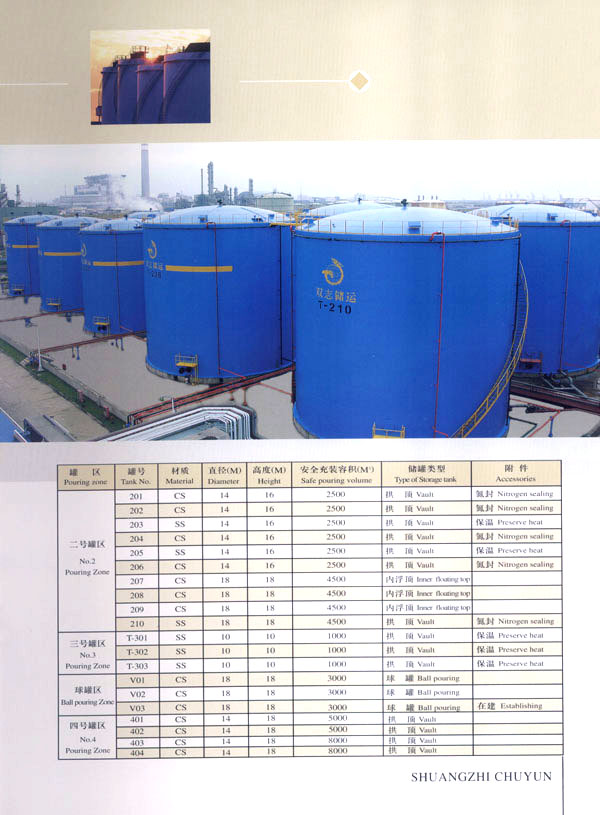 常州市雙志石油化工儲(chǔ)運(yùn)有限公司,位于國(guó)家一類對(duì)外開放口岸常州石化港區(qū),是一家專業(yè)石油化工產(chǎn)品倉(cāng)儲(chǔ)公司。罐區(qū)占地78畝,建有各種化工儲(chǔ)罐30座(總庫(kù)容為10萬(wàn)m3)及相應(yīng)的倉(cāng)儲(chǔ)配套設(shè)施。經(jīng)海關(guān)批準(zhǔn),設(shè)有海關(guān)保稅庫(kù)和海關(guān)監(jiān)管庫(kù)。公司專業(yè)從事石油化工產(chǎn)品倉(cāng)儲(chǔ)、中轉(zhuǎn)、分撥、灌裝業(yè)務(wù),以及進(jìn)出口貨物的代理報(bào)關(guān)、接受金融機(jī)構(gòu)委托提供動(dòng)產(chǎn)質(zhì)押監(jiān)管服務(wù)。