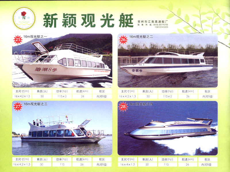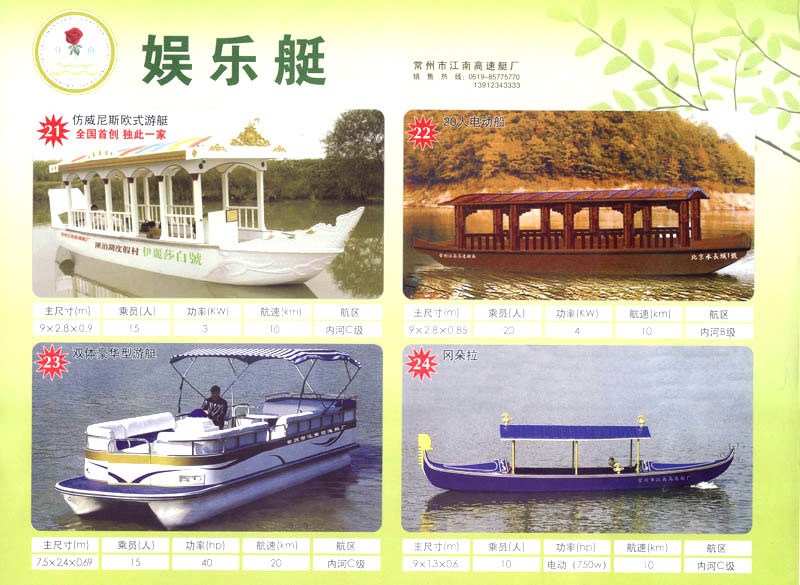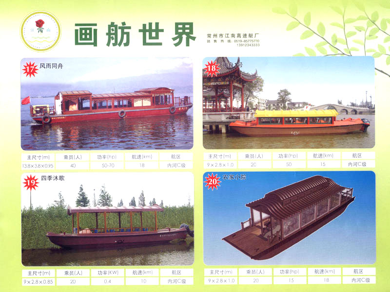 隨著人民生活的提高和水上旅游業(yè)的不斷發(fā)展,原有的游艇已遠(yuǎn)不能滿足人民群眾不斷提高的需求。為適應(yīng)水上旅游業(yè)市場的變 化,我廠開發(fā)研制了符合中國國情、具有民族特色的仿古畫舫游艇及國際最新流行款式一城市旅游休閑觀光艇。特別近兩年又開發(fā)了一批精品畫舫船投放市場之后深受景區(qū)的歡迎。今年我廠又開發(fā)了適用少數(shù)民族的“風(fēng)雨橋”、“寨門”畫舫艇。在湖南、廣西、云南、貴州深受愛戴。此艇別具風(fēng)格,民族風(fēng)情特別濃厚。侗鄉(xiāng)一號計(jì)劃在2006年5月1日投放在貴州黎平侗鄉(xiāng)風(fēng)景區(qū)八舟河景區(qū)使有(風(fēng)序號)。我廠歡迎用戶來圖加工,來廠考察訂貨,畫舫艇款式多多,終有一款適合你。歡迎來電來函垂詢。索樣即寄。誠心銷售、人情化服務(wù)、企業(yè)文化、精品畫舫。
