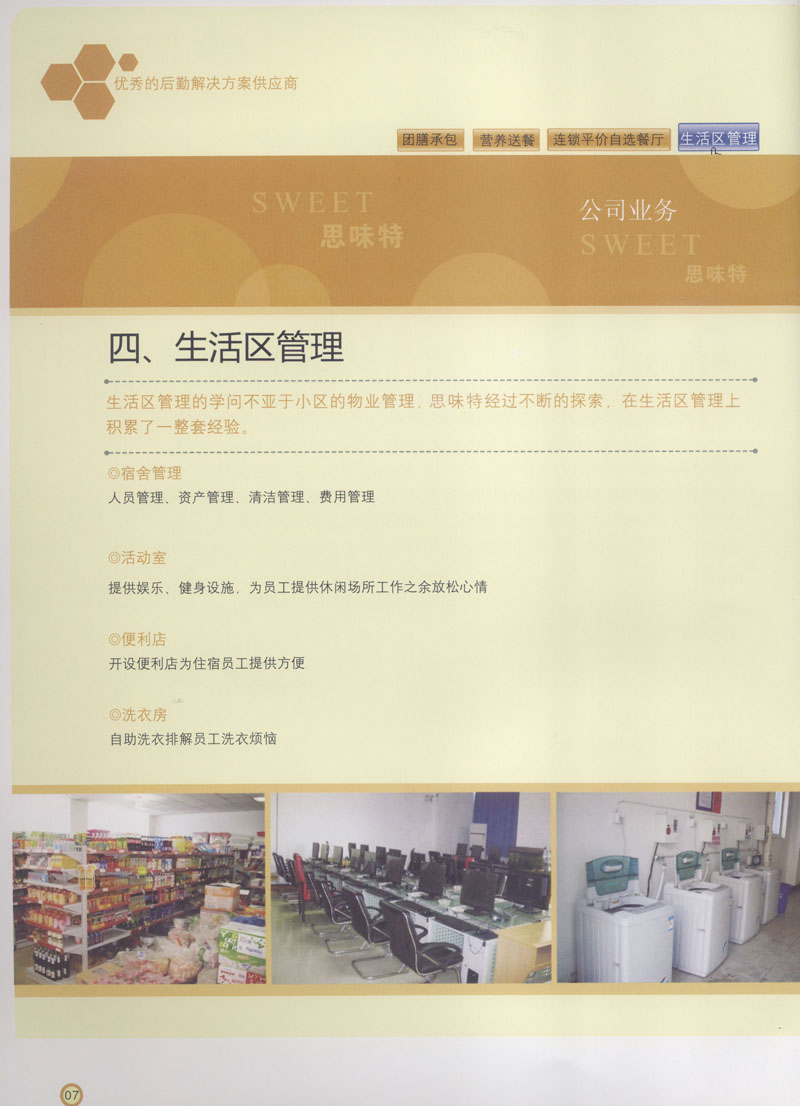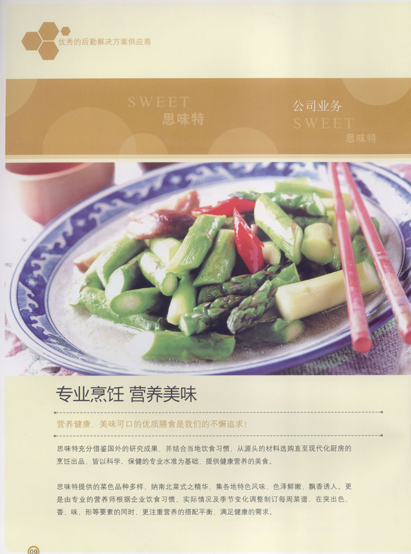 常州市思味特餐飲有限公司是一家專業(yè)從事企事業(yè)后勤服務(wù)的有限責(zé)任公司,公司從承包食堂起步,逐漸發(fā)展為經(jīng)營(yíng)團(tuán)膳承包、營(yíng)養(yǎng)送餐、生活區(qū)管理、連鎖餐廳的綜合型企業(yè)。2008年公司斥資100萬(wàn)元,在常州興建了可以同時(shí)提供3000餐膳食的中央廚房,重點(diǎn)打造“和美客”后勤服務(wù)品牌,全力為企事業(yè)單位解決后勤后顧之憂。 到目前為止,我們合作成功的企事業(yè)單位超過50多家,服務(wù)人數(shù)突破15萬(wàn),合作單位包括國(guó)家機(jī)關(guān)、國(guó)有企業(yè)、三資企業(yè)、民營(yíng)企業(yè)、學(xué)校、醫(yī)院等,其中不乏國(guó)際知名品牌公司。 和美客愿為更多的國(guó)內(nèi)外企事業(yè)單位及機(jī)關(guān)團(tuán)體分憂解難,從廚房設(shè)計(jì)、菜品配送、團(tuán)膳承包、到生活區(qū)管理等提供全方位的服務(wù)。