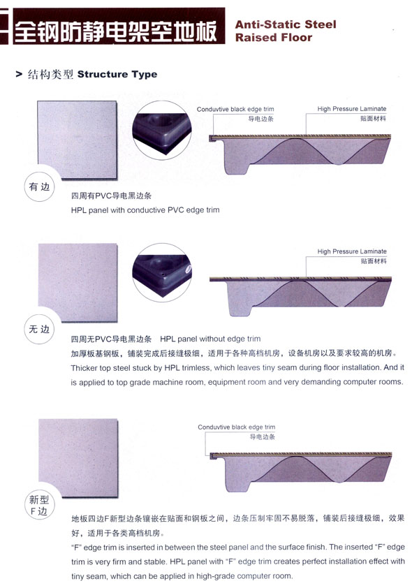 公司廠區(qū)面積30000平方米,擁有全鋼地板生產(chǎn)線兩條,木基、硫酸鈣基地板生產(chǎn)線各一條,年綜合產(chǎn)能100萬平方米。生產(chǎn)蘇杰牌防靜電地板系列和蘇杰牌網(wǎng)絡(luò)地板系列,主要產(chǎn)品有全鋼防靜電架空地板、全鋼OA網(wǎng)絡(luò)地板、瓷磚貼面防靜電地板、硫酸鈣防靜電地板、木基防靜電地板、鋁合金防靜電地板、防靜電通風(fēng)地板等。