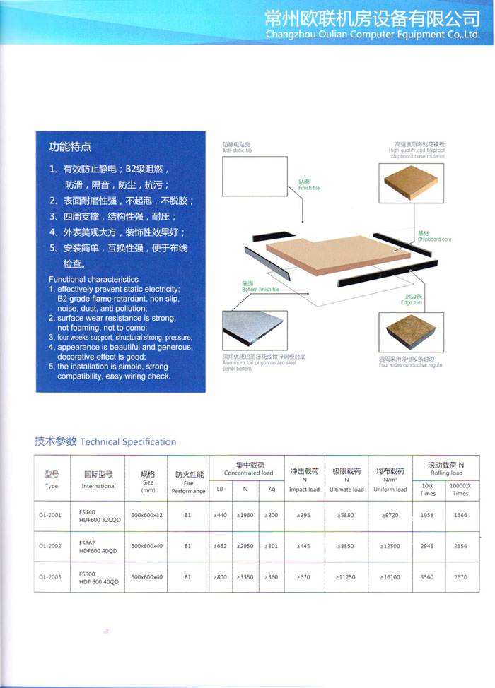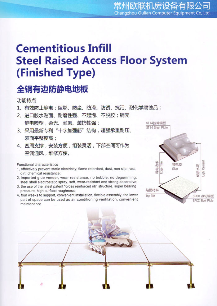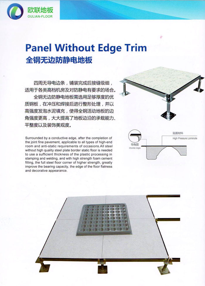 “歐聯(lián)”系列全鋼地板,符合國(guó)家安全要求,種類完備多樣,其中防靜電陶瓷地板、硫酸鈣地板等除具有普通瓷質(zhì)的裝飾和實(shí)用性外,其耐磨、防水、防火功能優(yōu)于其它同類產(chǎn)品,防靜電系列地板,能切合不同客戶的要求,其靈活的配置,深受客戶歡迎,不同材質(zhì)的地板結(jié)構(gòu)使設(shè)計(jì)師的設(shè)計(jì)空間比傳統(tǒng)的更加廣闊自由和善變。