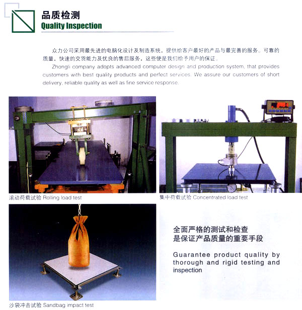 公司生產(chǎn)防靜電鋼質(zhì)、木質(zhì)機(jī)房地板和強(qiáng)化復(fù)合地板及各種電腦操作臺(tái)系列產(chǎn)品。該產(chǎn)品廣泛應(yīng)用于電子機(jī)房、通訊機(jī)房、各類(lèi)實(shí)驗(yàn)室和管線鋪設(shè)集中的防靜電場(chǎng)所以及家庭、大型商場(chǎng)的裝飾。公司技術(shù)力量雄厚、管理科學(xué),已具有設(shè)計(jì)、開(kāi)發(fā)、市場(chǎng)營(yíng)銷(xiāo)及售后服務(wù)的專(zhuān)業(yè)人才隊(duì)伍。