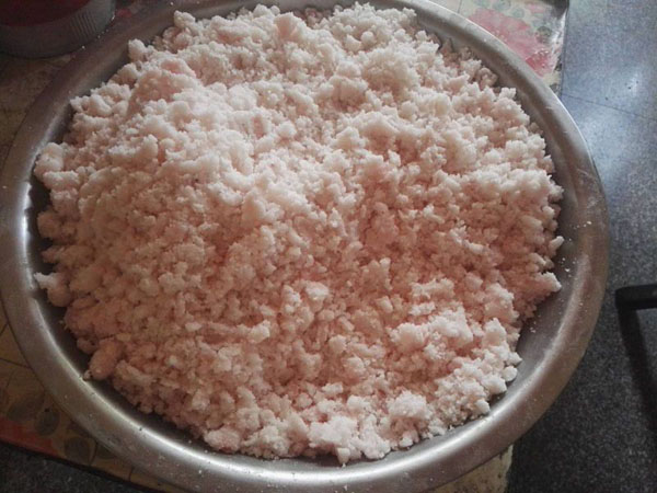 每天凌晨一兩點(diǎn)鐘,沈國(guó)平就要去采買(mǎi)當(dāng)天最新鮮的豬板油,回來(lái)清理干凈,和上面粉攪拌均勻,制成面團(tuán)。麻糕的制作主要由沈國(guó)平妻子和兩個(gè)姊妹來(lái)完成。揉面、搓胚子、配油酥,按餡心、搟均勻,整個(gè)過(guò)程行云流水,連貫無(wú)比。