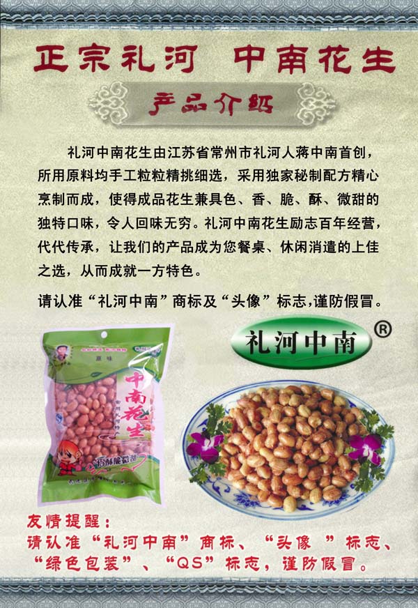 正宗的中南花生為綠色包裝,包裝上有“禮河中南”花生創(chuàng)始人蔣中南先生的頭像以及QS生產(chǎn)許可標(biāo)志,請廣大客戶認(rèn)準(zhǔn)購買,以防假冒。