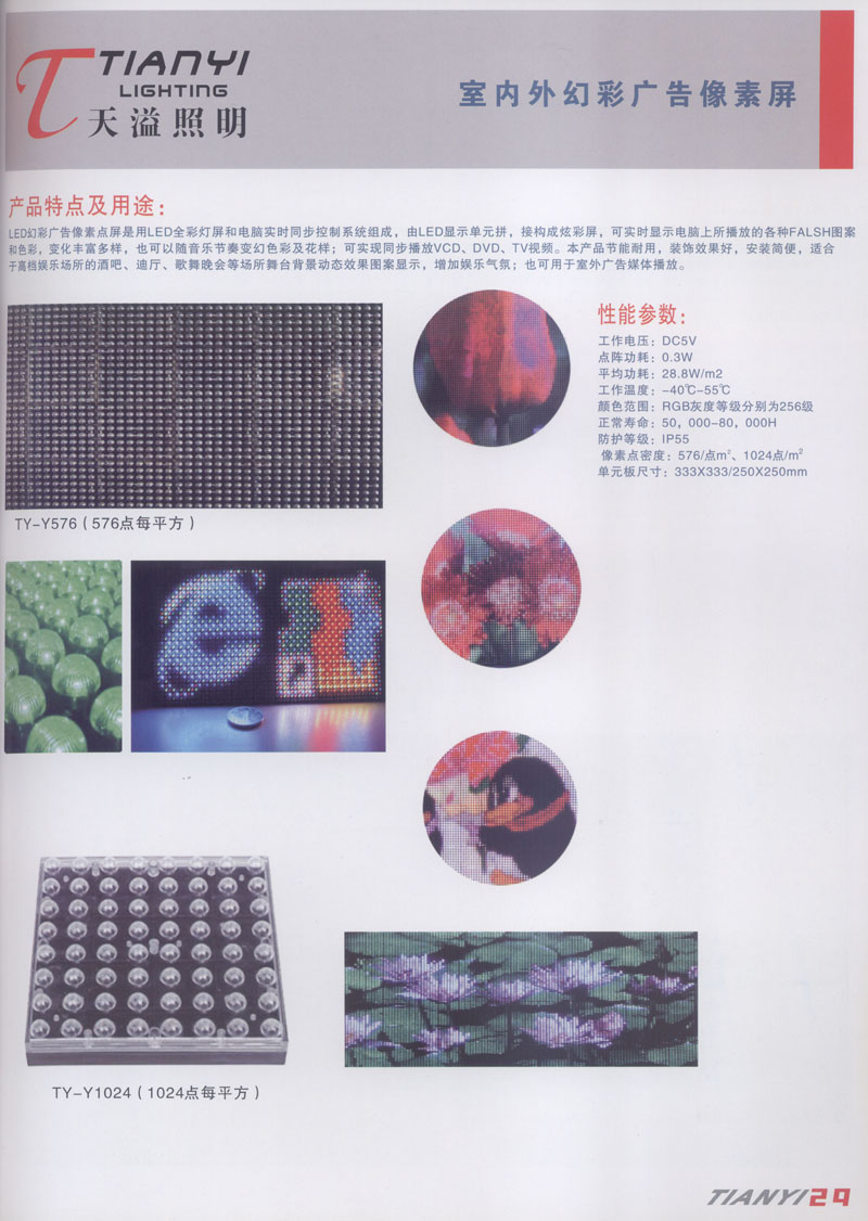 天溢照明是中國(guó)領(lǐng)先的專業(yè)從事LED廣告照明裝飾燈具設(shè)計(jì)、系統(tǒng)開發(fā)、燈具制造、工程服務(wù)一體的專業(yè)型公司,本公司產(chǎn)品已廣泛應(yīng)用于全國(guó)大多數(shù)城市夜景亮化景觀照明、酒店休閑娛樂夜場(chǎng)夢(mèng)幻燈光、戶內(nèi)外廣告宣傳、建筑及室內(nèi)照明以及家居裝飾等場(chǎng)合。 本公司產(chǎn)品涵蓋景觀裝飾照明、商用照明、居家照明、信息廣告顯示等領(lǐng)域,我們將性能可靠與適中價(jià)格的LED全系列產(chǎn)品帶到世界各個(gè)、角落。